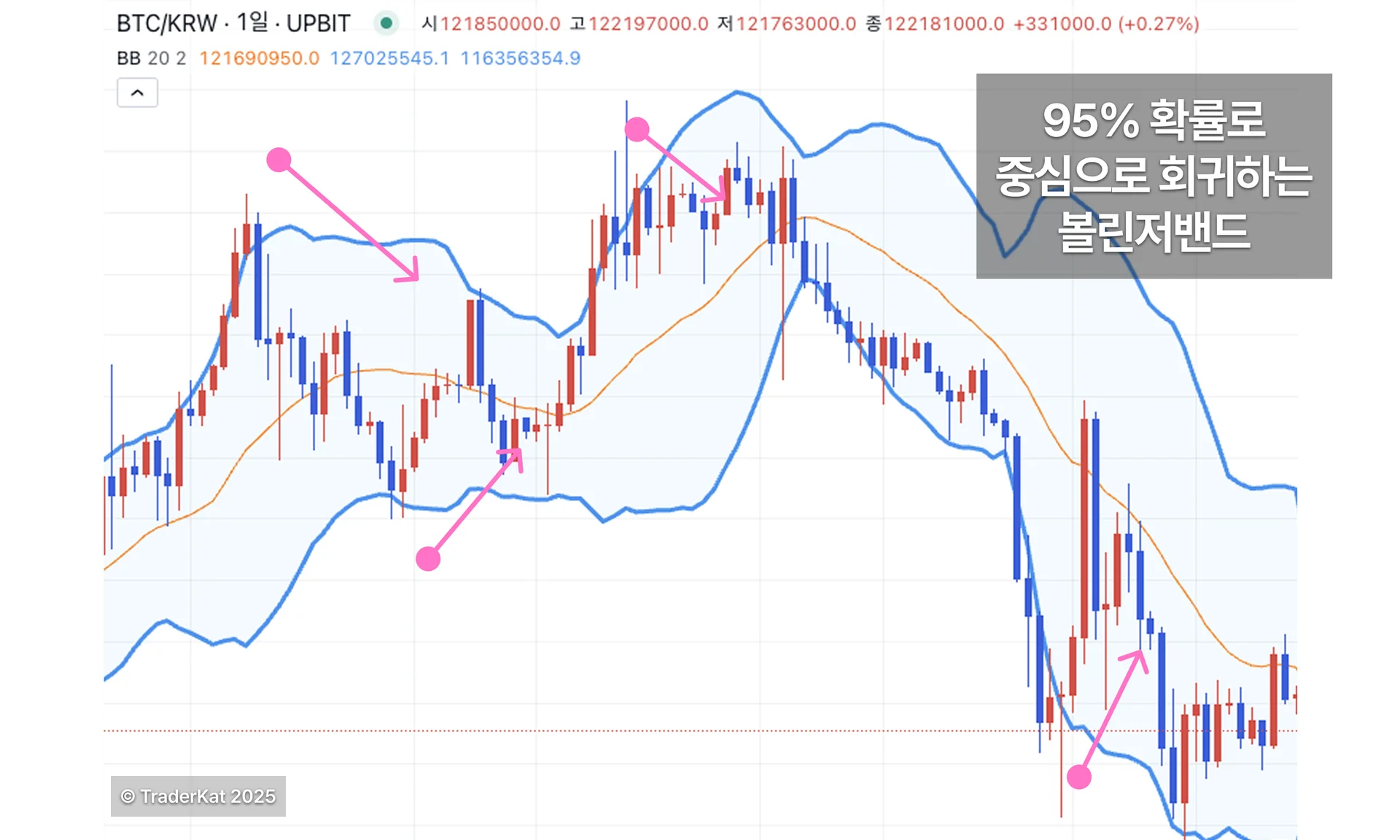 → 즉, 가격이 밴드 밖으로 나가는 일은 이례적인 상황이며,