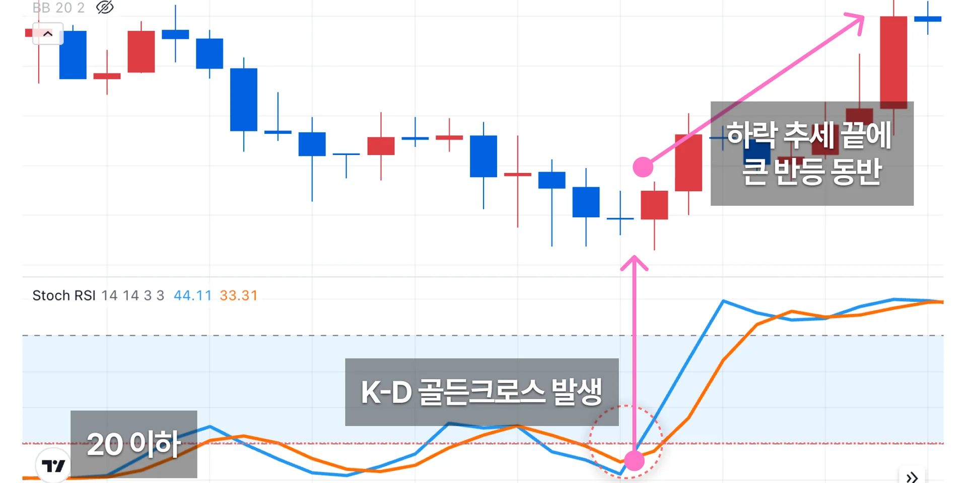 특히 %K가 20 이하에서 %D와 골든크로스할 때